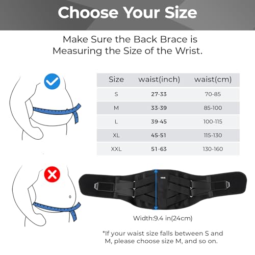 Find Your Perfect Size: The back brace comes in five sizes, S: waist 27″-33″, M: waist 33″-39″, L: waist 39″-45″, XL: waist 45″-51″, XXL: waist 51″-63″. Prior to confirming your order, be sure to consult the size chart and measurement guide, verifying the chosen size for your waist. If your waist size falls between S and M, please choose size M, and so on.
