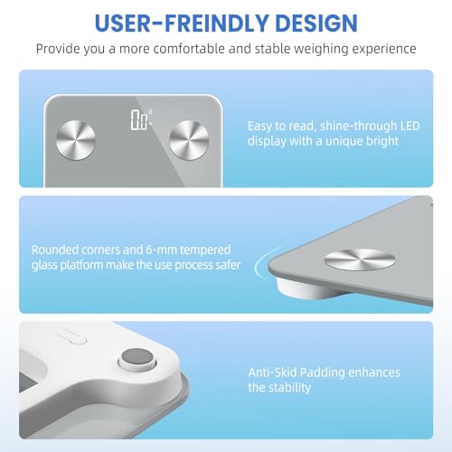 【STABLE AND SOLID PLATFORM】This BMI scale measures 11*11*0.98 inch, comfortable for all size feet and easy to store. Our 6-mm tempered glass platform provides exceptional durability and comfort. Rounded corners and anti-slip pads make the scale safer.