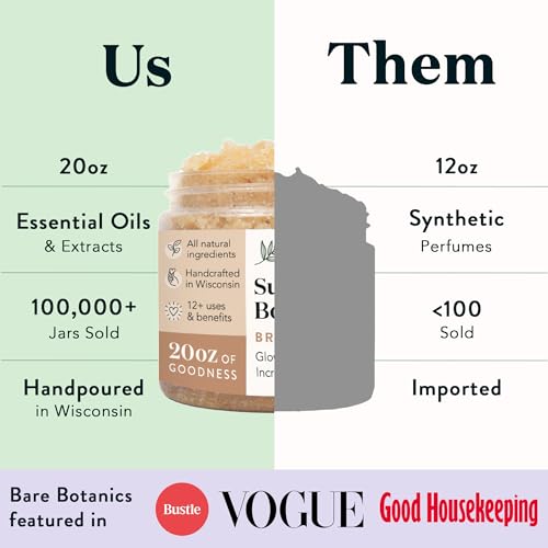 Bare Botanics Brown Sugar Body Scrub 20oz | Made in Madison, WI | All Natural Sugar Exfoliator w/Skin Loving Moisturizers | Vegan & Cruelty Free | Gift Ready Packaging w/a Cute Wooden Spoon