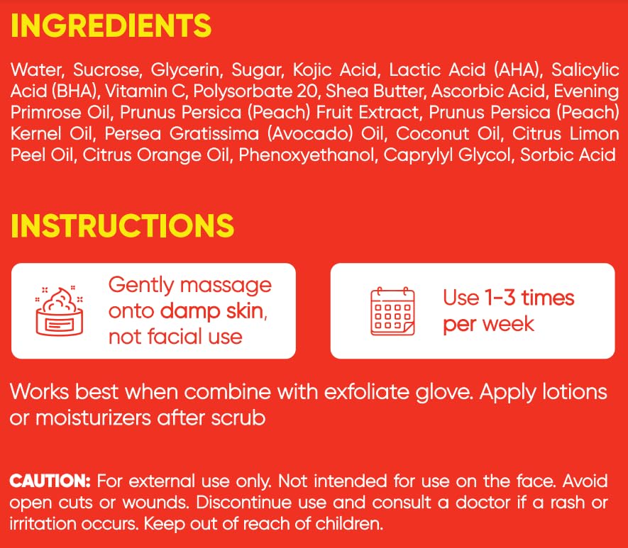 SOFT SKIN: Featuring 5% Glycolic Acid (AHAs), 2% Salicylic Acid (BHA), 2% Kojic Acid, 1% Vitamin C, Shea Butter, and Avocado Oil, gently polishes, deeply moisturizes, and reveals radiant skin. Get that glow-up!