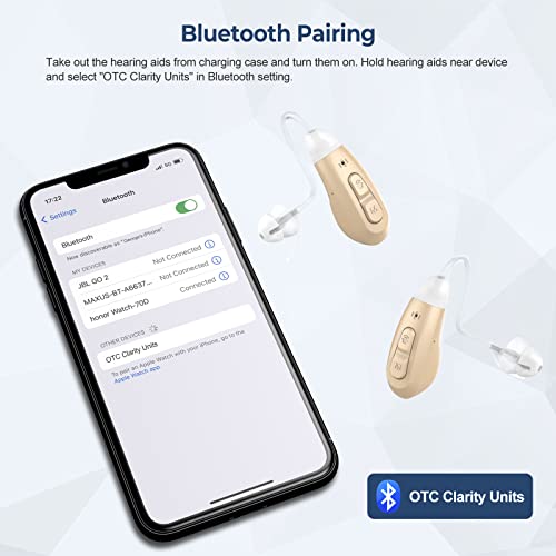 Bluetooth Connection: stream music, tv shows, moive and phone call direct into hearing aidsGenuine OTC hearing aids with trackable serial numberCulting-edge algorithms provide additional 40% of background noise reductionWider Frequency Range: ≤250Hz, ≥5000Hz, hear more rich and natural soundsTotal Harmonic Distortion: ≤2%+3%, Less Distortion, more genuine sounds66 Hours Backup Power: one charge lasts more than a weekPower Display: the battery bar on charging case showing remaining powerLightweight and comfortable for everyday fitAdjustable Volume and 4 Programs for different situations