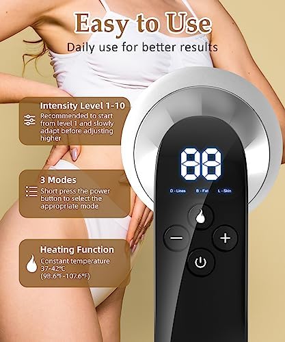 Multi-Functional Design: The cellulite machine uses constant temperature technology that is safe and gentle with your skin. It features 3 modes, 10 intensity levels and a cordless design for easy handling on all areas of your body. (note: Do NOT use it on your face)