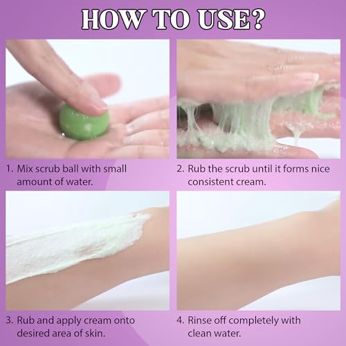 Special, Delicate Texture: our bath scrubs are unlike any other on the market. These magical spheres transform into a rich, creamy texture. You’ll feel the difference instantly as it delicately caresses your skin.A Variety of Dreamy Flavors: whether you’re in the mood for something fruity, fresh, or sweet, our range of flavors offers a pick for every mood and occasion: apple, lemon, blueberry, strawberry, and grape. Their delightful scent will reinvigorate your body and give you a boost of confidence after each bath.No More Product Waste and Messy Applications: we are revolutionizing the sugar scrub experience. The single-use balls are designed to provide a hassle-free, no-crumbs application. The creamy texture ensures a seamless and mess-free dispersal on any part of your body. You are really getting the most out of your purchase.The Perfect Gift for Radiant Skin: our bath scrub for body is the essence of skincare and makes an ideal gift for those who appreciate the finer things. Share the secret to glowing, healthy skin with your loved ones! A gift they’ll cherish and thank you for.