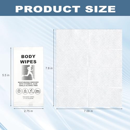 Appropriate size design: these body cleansing wipes are very convenient to carry, whether for travel, outdoor activities, or daily life, they can be placed in a backpack, pocket, or handbag.Packaging bag size:2.75x 5.5inches/7x14CM,Each wipe measures 7.09 x7.8inches/ 18 x 20cm.The size can clean your body, hand,s or face.