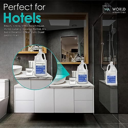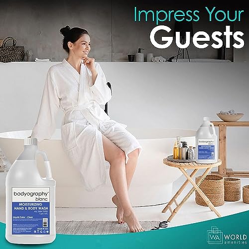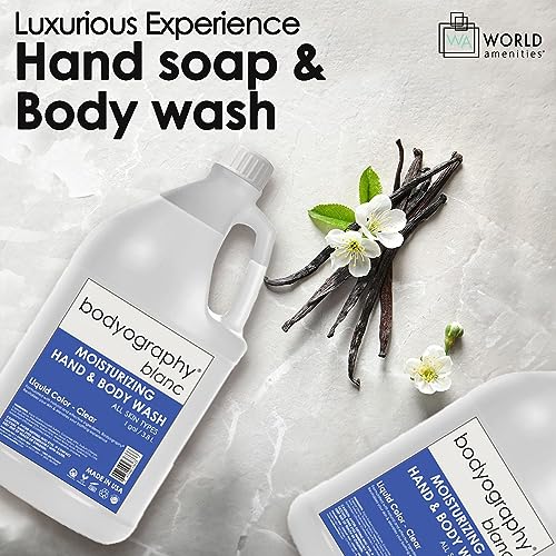 Experience high-end hospitality with Bodyography Blanc Moisturizing Hand Soap and Body Wash. This exquisite refill collection is designed to elevate your amenities, providing a luxurious touch for your guests. The refreshing scents of Vanilla Sea Salt and Vanilla Bourbon with White Tea & Ginger will transport them to a world of relaxation and indulgence. Crafted with care, this sulfate-free hand soap and body wash is made from a natural mineral-based formulation. It is specifically created to be suitable for all skin types, ensuring a gentle cleanse that won’t agitate or irritate the skin. Impress your guests with this exceptional product. Ideally suited for a variety of settings, including hotels, resorts, vacation rentals, spas, salons, and even charitable events, this refill bottle is the ideal solution for maintaining impeccable hygiene standards. It is also a fantastic choice for office environments, gyms, guest bedrooms, and tanning salons. Not only does Bodyography prioritize your guests’ well-being, but they also care for the environment. Our packaging is made with EcoPure, an organic additive that causes the plastic to biodegrade naturally. By choosing this product, you are actively contributing to a sustainable future. Rest assured, the products are cruelty-free, and vegan-friend, making them a conscious choice for both you and your guests. In terms of convenience and economy, Bodyography offers a 1-gallon refill bottle, ideal for restocking wall-mounted and standalone dispensers. This ensures an easy and efficient way to maintain a continuous supply of this revitalizing hand soap and body wash. Indulge your guests with the revitalizing and replenishing benefits of Bodyography Blanc Moisturizing Hand Soap and Body Wash. Enriched with mineral-based formulas and a commitment to ethical and sustainable practices, this product is a must-have for any hospitality establishment.