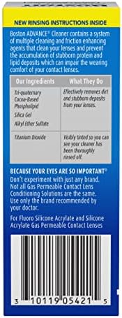 Boston Advance Cleaner heightens wearing comfort by removing lipids and proteins. Leaves your lenses clean, clear and ready for the disinfection step. Tri-Quaternary Cocoa-Based Phospholipid, Silica Gel, Alkyl Ether Sulfate – Effectively removes dirt and stubborn deposits from your lenses for clean, comfortable wear. Titanium Dioxide – Visibly tinted so you can see your cleaner has been thoroughly rinsed off. Because Your eyes are so important: Don’t experiment with just any brand. Not all gas permeable contact lens cleaners are the same.