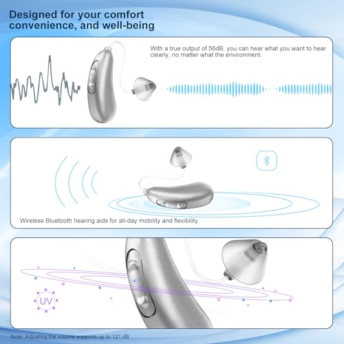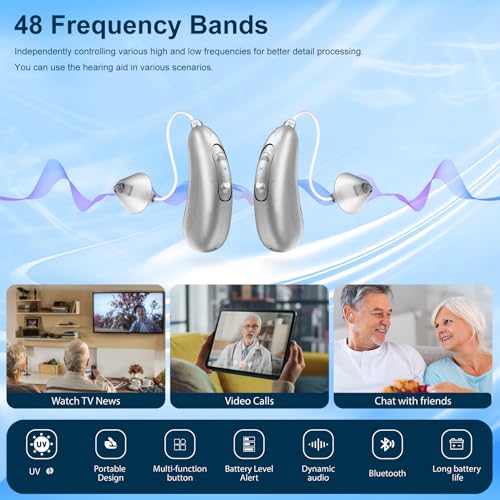 BTE Bluetooth Rechargeable Hearing Aids for Seniors, Behind-The-Ear BTE Ear Aids for Adults with Noise Reduction, No Whistling, 48 Sound Channels, Portable OTC Sound Amplification, Silver Pair