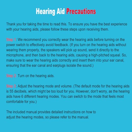 【Special Note】1. We recommend that you turn on your hearing aids after wearing them to effectively avoid whistling. If you turn on your hearing aids without wearing them properly, the speakers of the hearing aids will collect the sound and transmit it directly to the microphone, and then transfer it to the hearing aids, which will produce a shrill whistling, so be sure to wear them properly, and insert the hearing aids into your ear canals, so that the ear canals and earplugs will isolate the sound.