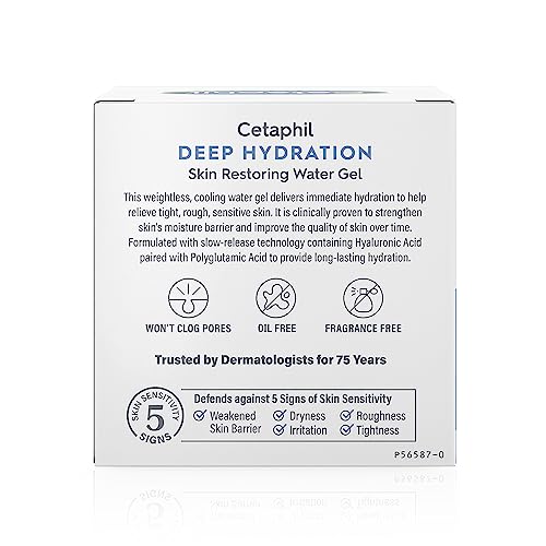 CETAPHIL DEEP HYDRATION Skin Restoring Water Gel is a weightless, oil free gel that’s clinically proven to instantly boost the skin’s water content and maintain hydration for 72 hours. Formulated with slow-release technology containing hyaluronic acid paired with polyglutamic acid to deliver immediate and long lasting hydration. The cooling gel facial moisturizer has an oil free, fragrance free and dye free formula that’s designed to be gentle on sensitive, dehydrated skin, with HydroSensitiv Complex™ to boost the skin’s water content while soothing skin sensitivity. This hydrating face moisturizer strengthens the skin’s moisture barrier and improves the quality of skin over time, while also providing immediate relief from dryness, roughness and tightness caused by excessive skin dehydration.