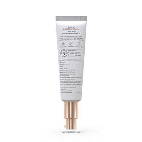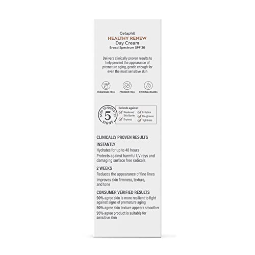 Protect your sensitive skin every day with CETAPHIL HEALTHY RENEW Day Cream SPF 30, developed with and recommended by dermatologists. This daily use face moisturizer with broad-spectrum SPF 30 hydrates and visibly smooths the look of fine lines while protecting against damaging UV rays. Powered by retinol alternative, purified peptides, this serum is clinically proven to help prevent and reduce the visible signs of aging while being gentle on even the most sensitive skin. This anti-aging face cream also contains vitamins B3 (niacinamide) and B5 (panthenol) to help hydrate, soothe and repair the skin barrier, plus botanical extracts (rice lees and edelweiss) to target visible dullness and uneven skin tone. This non-greasy formula absorbs quickly and provides long lasting hydration for up to 48 hours as well as daily protection from harmful UVA/UVB rays and surface free radicals. It defends against 5 signs of skin sensitivity – dryness, irritation, roughness, tightness and a weakened skin barrier.