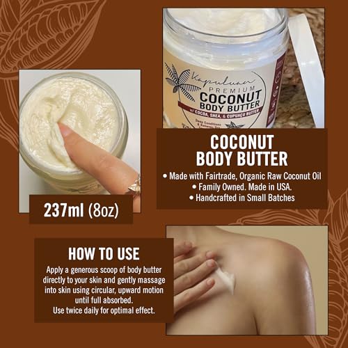 Deeply Hydrating & Light – Kapuluan Coconut Oil Body Butter provides moisturization for up to 24 hours. Truly, body butter is the best way to bring moisture to dry skin all day. Made with organic fair trade coconut oil and organic shea butter which are rich in antioxidant vitamin A and E to soften and protect your skin better than cocoa butter and shea body butter alone.