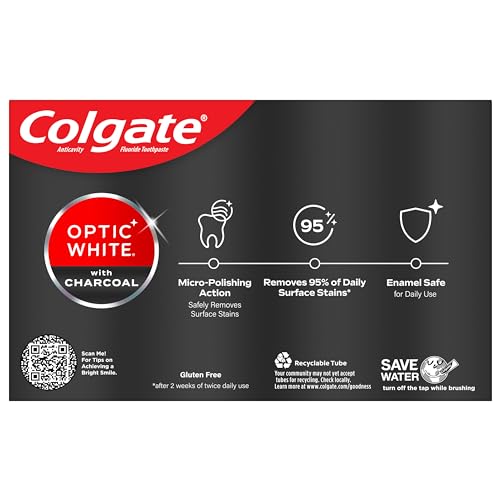 Colgate Optic White with Charcoal toothpaste is a stain removal whitening toothpaste with micro-polishing action to remove 5X more surface stains*. This teeth stain remover toothpaste contains clinically proven technology that safely removes surface stains and the formula helps prevent new stains from forming, so your teeth stay whiter longer. Plus, Colgate Optic White with Charcoal is a mint toothpaste with Cool Mint flavor that freshens breath. Colgate Optic White with Charcoal doubles as a whitening toothpaste that is enamel-safe for daily use. Add this teeth stain removal toothpaste to your oral care routine for teeth whitening and stain fighting. Colgate Optic White with Charcoal is also an anticavity fluoride toothpaste that helps to protect against cavities. For good hygiene, brush your teeth twice a day for two minutes. Colgate Optic White toothpaste is made by Colgate, the brand that knows the power of a healthy smile. *vs. ordinary non whitening toothpaste, after 2 weeks of continued use