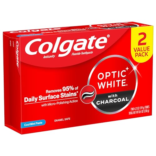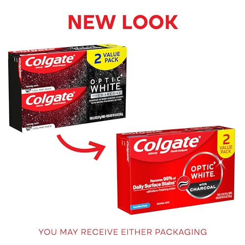 Colgate Optic White Charcoal Whitening Toothpaste, Cool Mint, Enamel-Safe with Fluoride, 2 Pack 4.2oz Tubes