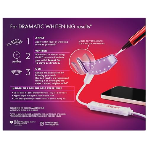 Whitening your teeth is easy with the Colgate Optic White ComfortFit LED Teeth Whitening Kit! Remove 10 years of stains in just 3 days with this teeth whitening kit. Fueled by indigo wavelength technology, the LED device amplifies the hydrogen peroxide serum for exceptional whitening results. The serum is safe on tooth enamel and is designed to deliver results with no tooth sensitivity. Plus, the lightweight, flexible LED device molds to your mouth for uniform whitening and a comfortable experience. The combination of the flexible LED whitening light and Colgate Optic White Overnight whitening pen helps to effectively whiten your smile and remove teeth stains. Lightweight, portable and easy to use, this teeth whitening kit with led light plugs into your smartphone (iPhone or Android). Use it for 10 minutes a day for 10 days to see dramatic results!* With Colgate Optic White, you can find the confidence to soak up everything life has to offer without worrying about it soaking into your teeth. Go ahead and live your life to the brightest with this Colgate teeth whitening kit! *When used as directed.