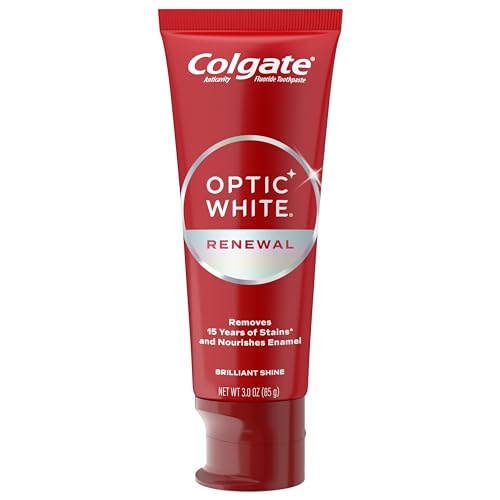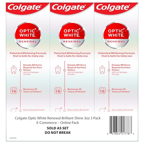 Welcome a brilliantly white smile with the Colgate Optic White Renewal Teeth Whitening Toothpaste. This 3 pack of whitening fluoride toothpaste removes 15 years of stains* and effectively removes tea, coffee, and wine stains. The patented whitening toothpaste contains 5% hydrogen peroxide to deeply whiten beyond surface stains to help you achieve a white smile. Colgate Optic White Renewal Brilliant Shine Toothpaste is a whitening toothpaste that contains fluoride to nourish enamel and is enamel-safe for daily use. This teeth whitening toothpaste is also an anticavity fluoride toothpaste to help prevent cavities. Deeply whiten beyond surface stains with the Colgate Optic White Renewal Toothpaste. Reveal a confident smile with the Colgate Optic White Renewal Teeth Whitening Toothpaste. Use this powerful whitening toothpaste to nourish your enamel and deeply whiten teeth. Colgate Optic White Renewal Brilliant Shine Toothpaste is a mint toothpaste that is gluten free, sugar free, and vegan. Unlock a white smile with the Colgate Optic White Renewal Teeth Whitening Toothpaste.  *when brushing twice daily for 2 weeks