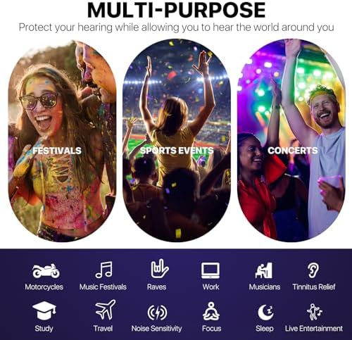【Comfortable and Versatile】Made from soft and flexible silicone, ensuring a comfortable and secure fit. Perfect for Concerts, Festivals, Raves, Musicians, Sports Events, Live Entertainment, Drummers, Party, Motorcyclists, Sleeping, Snoring, Travel and more while delivering noise-canceling noise reduction.