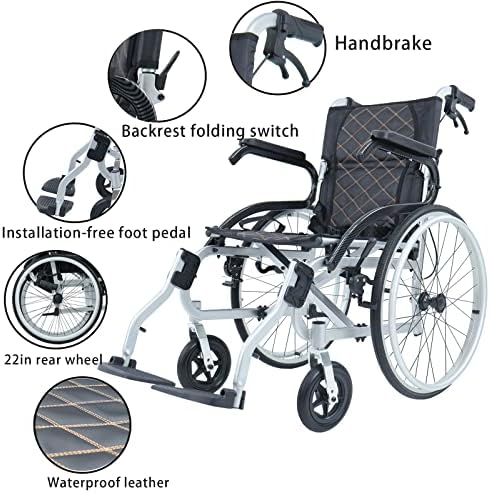 High quality material: The metal material of the whole wheelchair is aluminum alloy, and the thickness of the tube wall is 2mm. The hand ring of the wheel is also aluminum alloy, which is strong and durable. The wheelchair has a net weight of 25lbs (including wheels) and a load-bearing capacity of 220 lbs.