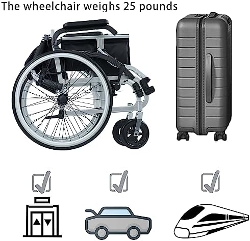 High quality material: The metal material of the whole wheelchair is aluminum alloy, and the thickness of the tube wall is 2mm. The hand ring of the wheel is also aluminum alloy, which is strong and durable. The wheelchair has a net weight of 25lbs (including wheels) and a load-bearing capacity of 220 lbs.