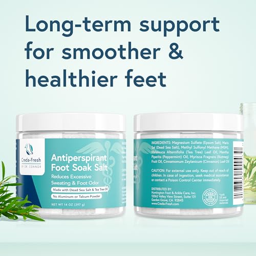 NATURAL ANTIPERSPIRANT FOOT SOAK – Our Creda-Fresh Foot Bath Salt is formulated to neutralize foot odors and control excessive sweating, providing long-lasting freshness and comfort. Infused with pure Epsom salt, this foot detox soak offers comprehensive support for dry skin, calluses, and athlete’s foot.