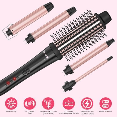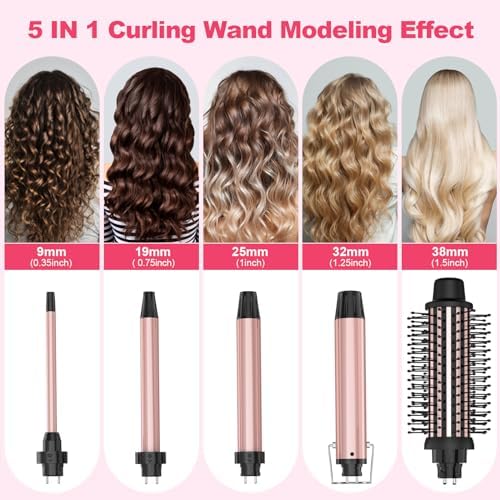 5 In 1 Curling Iron Set: 0.35″ 3/8 Small Curling Wand, Chopstick Curling Wand; 0.75″ 3/4 Small Waves Curling Wand: 1″ Beach Waves Curling Wand; 1.25″ 1 1/4 Large Waves Curling Wand; 1.5″ 1 1/2 Large Curling Brush And Heated Brush;