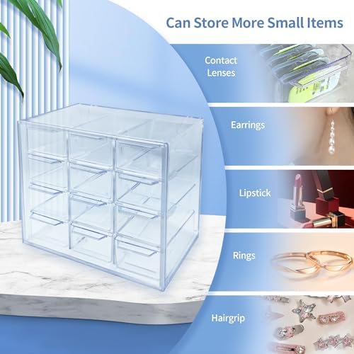 Transparent design: Different types of contact lenses can be saved in individual grids,and transparent design makes it easier to find the desired contact lens. Super capacity: 12 lattice super capacity storage boxes, each compartment can hold up to 16 pieces,suitable for all brands of daily contact lenses. Drawer design: Plastic drawer design with handle is easier to pull. More functions: The storage box can not only store contact lenses,but also can store earrings, hair clips,lipstick and other accessories. Space saving: There are wall mounting holes on the back,which can be hung on the wall to save space.