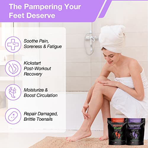SOAK YOUR TIRED FEET AWAY [2-PACK]: To take complete care of your tired feet, the DAILY REMEDY foot soak kit includes: Muscle Relief foot soak for post-workout recovery and a Calming Lavender Foot soak to revive tired feet. Fast dissolving and with great foot cleansing properties, they are perfect for athletes, sportspeople or anyone seeking for a complete foot-care routine at home!