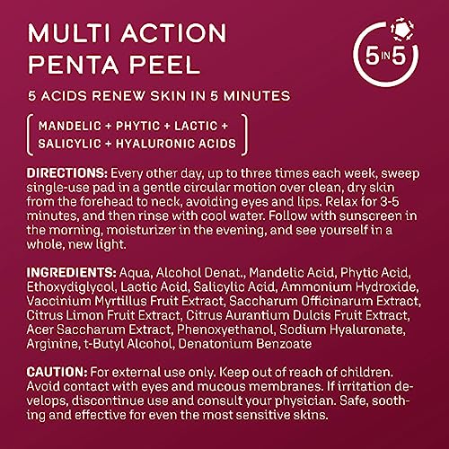 DCL Skincare Multi-Action Penta Peel renew skin in 5 mins, gentle acid peel, resurfaces, unclogs pores, hydrates, Salcylic, Mandelic, Phytic, Hyaluronic and lactic acids 50 pads