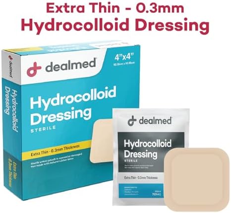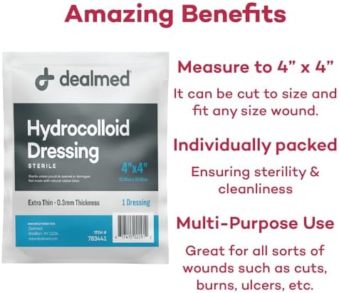 Dealmed 4” x 4” Extra Thin Hydrocolloid Dressings, Box of 10: The Dealmed Hydrocolloid Dressings make wound care completely hassle free and easy to do, much more so than regular wound care bandages. They are a flexible and absorbent dressing that creates a moist healing environment that helps with pain and discomfort.