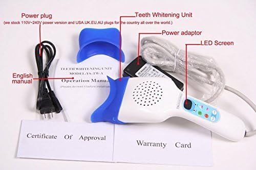 Specifications 1. AC100-240v,50/60Hz. 2. Suitable for more brands tooth whitening. 3. 1-20 minutes adjustable timer, 2 light intensities . 4. 6pcs high power LED, fan-cooled . 5. Simple,light and handy molding design. 6. Small and light designed, easy operation. 7. High Light Internsity Mode 6000mw/c㎡ . 8. Low Light Intensity Mode 3000mw/c/c㎡. 9. Wave Length Range: 420-480nm.