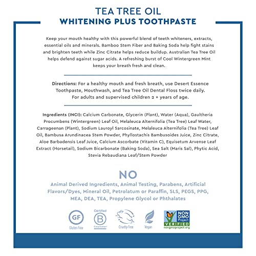 Desert Essence Tea Tree Oil Whitening Toothpaste 6.25 oz – Non-GMO, Gluten Free, Vegan, Cruelty Free – Bamboo Stem Fiber & Baking Soda – Bright Smile, Fresh Cool Breath – Wintergreen Mint