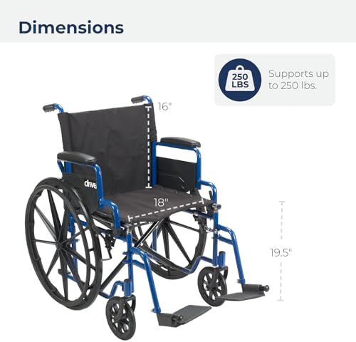 Drive Medical Blue Streak lightweight wheelchairs for adults and seniors feature cutting-edge design elements like swing-away footrests, calf straps, and flip-back armrests for easy transfers. These portable, lightweight wheelchairs feature an 18-inch padded seat ergonomically crafted for comfort and a convenient seatback pocket. The detachable tires, made of solid rubber and mounted on composite wheels, ensure a consistently smooth ride and feature push-to-lock functionality for extra safety. The sleek blue-powdered wheelchair frame is finished with durable steel and supports up to 250 pounds. The black cross brace and nylon seat upholstery are sturdy, lightweight, and easy to clean. Wheelchair easily folds to a compact 12.5-inch width, and at just 41.25 pounds, the foldable wheelchair can be lifted to trunk or storage. Backed by a limited three-year warranty and from Drive Medical, a leading brand of mobility aids, bath safety products, and other medical goods for more than 20 years, you can purchase with confidence.