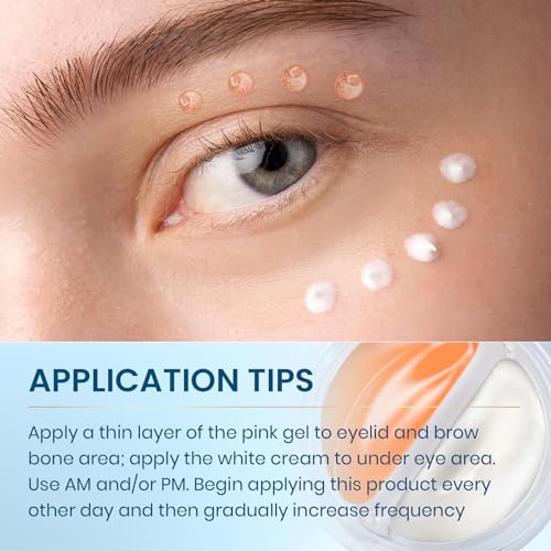 Begin by cleansing your skin, then apply a thin layer of the pink gel to the eyelid and brow bone area, while the white cream should be applied to the under-eye area. For optimal results, use both products in the morning and evening. Start with every other day application and gradually increase to daily use.