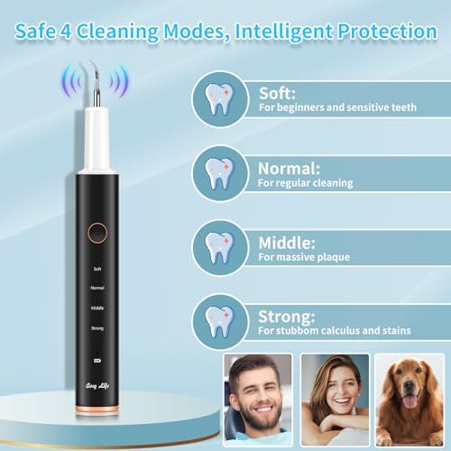 Safe & Painless 4 Adjustable Modes and LED Light, User-friendly: Our teeth cleaner adopt ultrasonic intelligent technology, which is safe to stop operation when it comes into contact with the gums. The tartar remover for teeth has 4 cleaning modes: including the soft, normal, middle, and strong modes. You can choose the suitable mode according to the adaption level of your teeth(We recommend beginners practice with the soft mode first). Built-in LED lights help you view dental stains clearly.