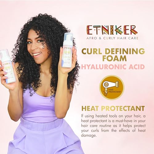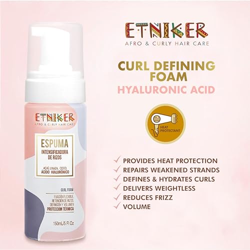 Unlock the secret to effortlessly beautiful curls with ETNIKER Curl Defining Mousse Foam. Designed to provide superior heat protection while delivering natural-looking, crunch-free curls, this innovative formula is your ticket to salon-quality results at home. Say goodbye to stiff, sticky residue and hello to luxuriously soft locks. Our Curl Defining Mousse leaves hair feeling silky-smooth with no flakiness, ensuring your curls are touchably soft and bouncy. Formulated with a blend of nourishing ingredients including Acai, flaxseed, coconut, and hyaluronic acid, it not only enhances shine but also boosts volume and provides frizz-free control for ultimate curl definition. With flexible fixation and curl retention, your curls will stay perfectly in place throughout the day, allowing you to flaunt your gorgeous locks with confidence. Whether you desire defined curls or added volume, our Curl Defining Mousse delivers stunning results every time. But that’s not all – our formula also offers thermal protection, shielding your hair from heat damage caused by styling tools. Now you can achieve your desired look without compromising the health of your hair. For best results, pair with ETNIKER’s Curl Defining Styling Cream to create your desired look and curl shape. Simply warm a generous amount of the Curl Defining Mousse between your palms, then evenly distribute and scrunch through each section of hair, working upwards towards the root. Allow your curls to air-dry or use a diffuser for added volume and definition. As with any styling product, exercise caution and keep out of reach of children. Avoid contact with eyes, and if irritation occurs, rinse thoroughly with water and discontinue use. For external use only. Store at room temperature and keep out of direct sunlight. Embrace your natural curls and experience the transformation with ETNIKER Curl Defining Mousse Foam – the ultimate solution for defined, frizz-free curls that shine with vitality.