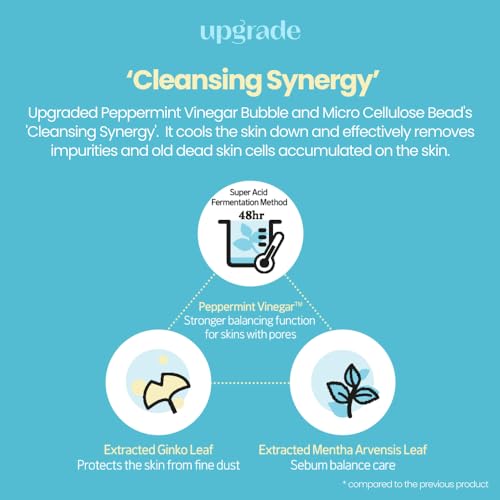 Upgraded Peppermint Vinegar Bubble and Micro Cellulose Bead’s ‘Cleansing Synergy’. It cools the skin down and effectively removes impurities and old dead skin cells accumulated on the skin.