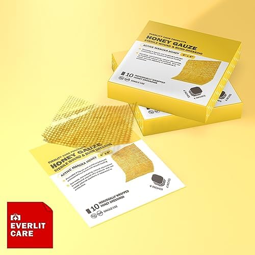 Everlit Care Honey Gauze – Medical Grade Manuka Honey Patches for Cuts, Skin Tears, Burns | Sterile Wound Care Burn Dressing 4″ x 4″ (Pack of 10)