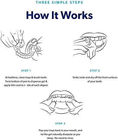 EASY TO USE: The brush application tip makes it so easy to apply. Simply dry off your teeth, brush a thin layer of the whitening gel to your trays and pop them in your mouth before you go to sleep. The safe and effective formula works overnight to remove stains and whiten teeth without damaging your smile or trays. Best alternative to whitening strips.