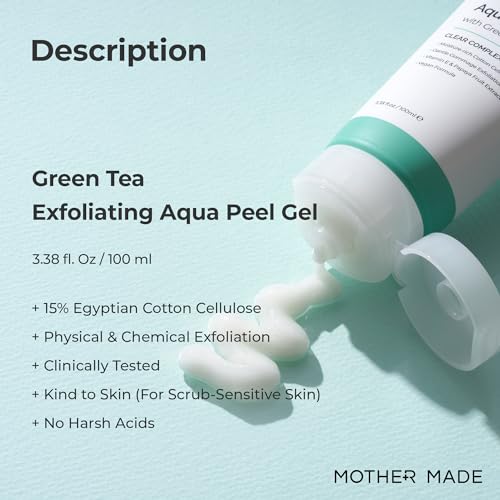 Super Gentle Exfoliation To Skin: Unlike harsh microdermabrasion scrubs or strong chemical acid peels that dissolve proteins, MOTHER MADE Exfoliating Aqua Peel Gel is formulated with moisture-rich cellulose fiber that softly balls up with grime only, without strong chemicals or stress to skin