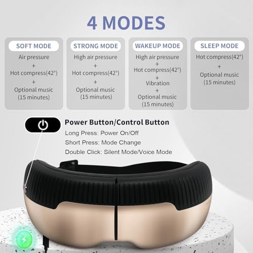 2 Levels Compression & 4 Modes: Kuidada eye massager uses a combination of heating, compression, and vibration. You can choose between 2 adjustable compression strengths and 4 modes. Designed to replicate the gentle sensation of being massaged by fingers, the airbags inflate to approximately the size of a thumb and accurately press acupuncture points around the eyes, which helps to freshen the eyes, dark circles, etc.