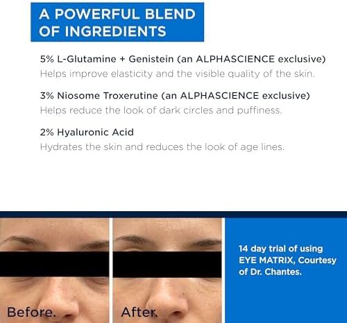 Rich Ingredients. Key ingredients 5% L-Glutamine (ALPHASCIENCE exclusivity) + Genistein work together to help visibly improve elasticity and the quality of the skin. 3% Niosome Troxerutine to reduce the look of dark circles and puffiness. Meanwhile, 2% Botox-like Tripeptide and 2% Hyaluronic Acid help to improve the look of the expression lines as well as hydrate the skin.