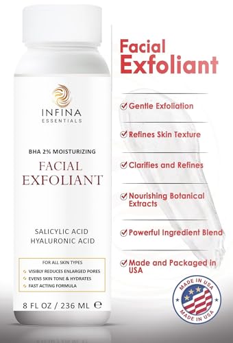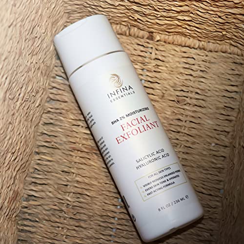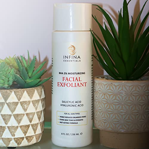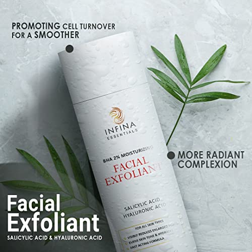 Facial Exfoliant for Deep Cleansing and Pore Refining: Our Infina Essentials Facial Exfoliant is a powerful BHA liquid exfoliant that deeply cleanses and refines pores, providing a thorough cleanse for smoother, healthier-looking skin