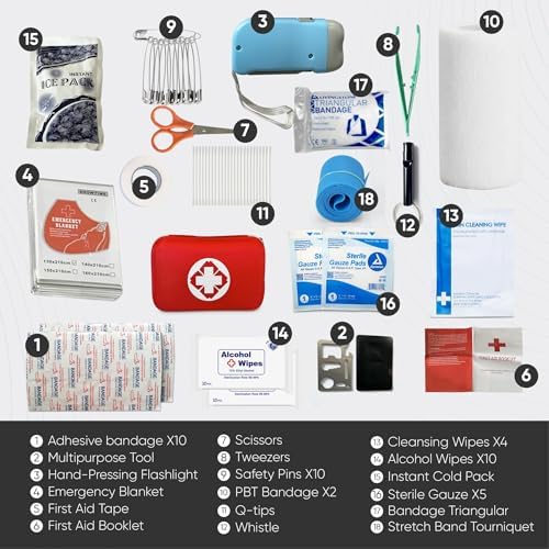 Pre-Packaged First Aid Kit Included: This first aid kit comes with a variety of medical supplies to treat common injuries, including bandages, antiseptic wipes, gauze pads, multipurpose tool, emergency blanket, scissors, tweezers, flashlight, and more.