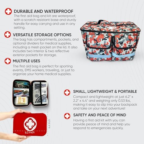 This first aid bag is perfect for outdoor activities, travel, and emergencies. It features a red camouflage design, a first aid kit with a waterproof hard case, optional dividers, a mesh pocket on the lid, 2 pockets inside the bag, and 2 reflective pockets on the outside. The bag is waterproof and moisture proof and has a scratch-proof bottom base. It also has a handle on top and a durable shoulder strap with metal clips. The bag is perfect for sporting events, EMS workers, traveling, or organizing your medical supplies. This first aid bag is a must-have for any emergency situation.