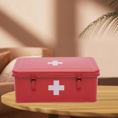 First Aid Kit Box, Red Medicine Box with White Cross, First Aid Supplies Organizer, Pills Storage Box Empty with Safety Lock & Portable Handles, Metal Storage Bin for Home Emergency Tool Set