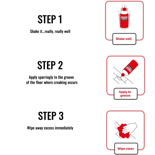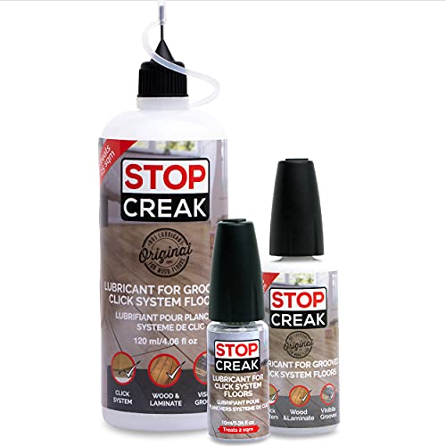 Stop Creak is a lubricant for click system floors that safely and effectively lubricate the interlocking sections of the floor that are prone to creaking. Stop Creak is odorless, non-flammable and designed to to lubricate once the carrier liquid component has evaporated. Stop Creak will not always be the answer to every squeaky floor problem, it cannot fix structural issues or creaks caused by the subfloor, beams or underlay. Try the small size first and if it works, buy more.