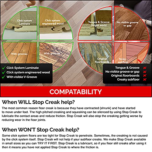 Stop Creak is a lubricant FOR CLICK SYSTEM FLOORS WITH GROOVES ONLY.