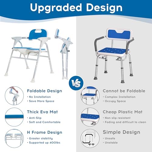 Foldable Upgraded Shower Chair with Armrests and Back,Heavy Duty Folding Bathtub Chair with Thicker Shower Seat for Elderly,Handicap,Disabled, Seniors & Pregnant,Supports Up to 400 lbs.(Blue)