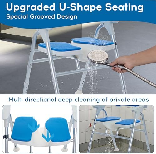 ๐ก๐ผ ๐๐๐๐ฒ๐บ๐ฏ๐น๐ฒ: The U-shaped seat of this shower chair allows for easy cleaning and effective washing. The special grooved design seat with non-slip texture surface and drainage holes can effectively drain water, providing you with the most comfortable use.