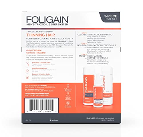 Our paraben & sulfate-free revitalizing hair product, Foligain’s Triple Action Hair Care System is made with our most potent 10% Trioxidil blend which targets hair from root to tip for the look of added density, fullness, and youthful vitality. The Liposphere micro-emulsion technology infuses hair and scalp with our exclusive 10% Trioxidil complex is the secret to our hydrating conditioner. The revitalizing hair formula is very easy to use. Apply 4 sprays to the scalp twice per day directly to area of hair loss or thinning. Leave on the scalp for 4 (or more) hours and then wash it. An advanced biotin shampoo, our volumizing shampoo also contains important hair nutrients such as Biotin and is boosted by Trichogen, Procapil, copper peptides and pea sprout extract for a truly comprehensive solution. Size and Other Details: This travel hair care set comes with trial size deep cleansing shampoo for men (3.4 Fl Oz), lightweight conditioner (3.4 Fl Oz.) and 10% complete formula serum (1 Fl Oz).