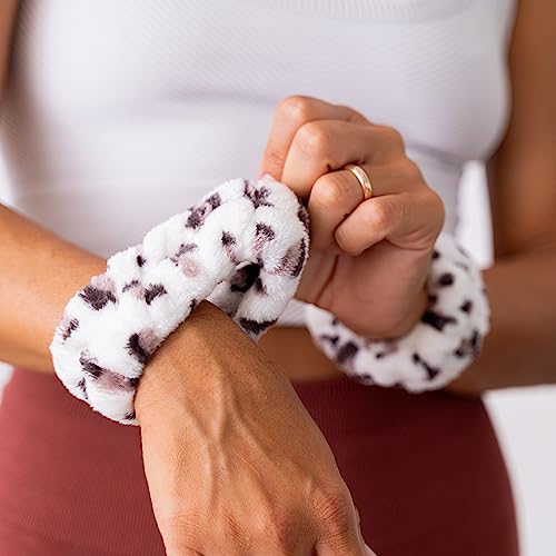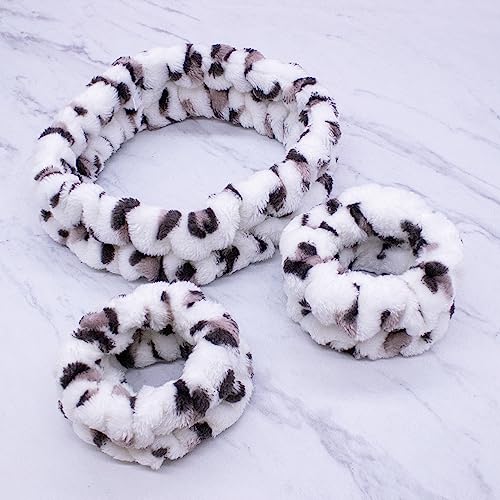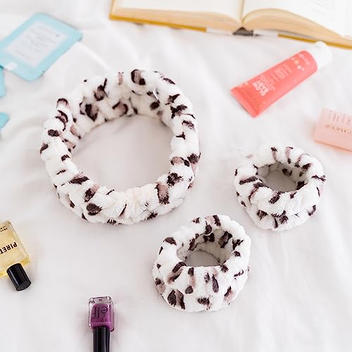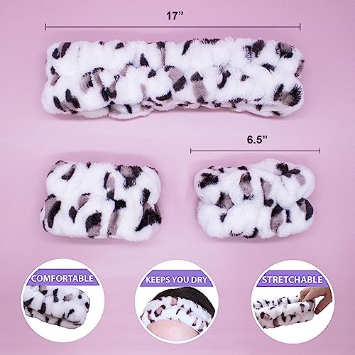 FROG SAC Puffy Spa Headband and Wristbands for Face Washing, Fuzzy Skincare Headbands for Women, Soft Makeup Skin Care Hair Accessories for Girls, Make Up Hair Band (Leopard)
